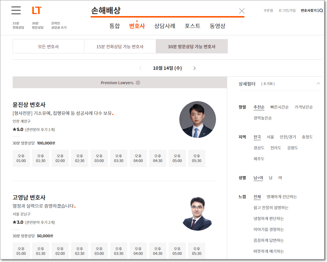 분야를 선택하게 되면 15분 전화상담과 30분 방문상담으로 크게 구분지어 변호사들의 소개가 이어진다. 변호사 평가 및 후기 등을 비용과 함께 참고하여 잘 선택해야 하는 부분이다. 변호사들의 과거 변호 이력 및 승소 결과 등은 아직 어떻게 찾아보는지 몰라서 이곳에 소개하지는 못하지만 추후 공부하게 되면 별도 게시글로 공유하도록 하겠다.
