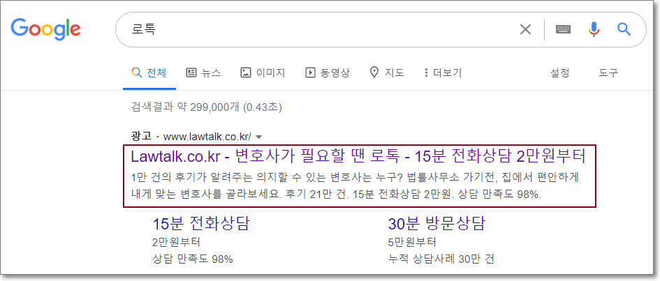 구글에서 광고를 하고 있는 관계로 '로톡'을 입력하고 검색을 하면 바로 상단에서 웹사이트가 검색된다.