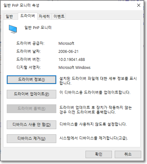 장치관리자 화면에서 아래 '모니터' 하위 항목에서 마우스 우클릭한다. 그리고 드라이버 탭의 '드라이버 삭제'를 선택한다. 여기서 주의할 점은 디바이스 제거가 아닌 드라이버 삭제를 선택해야 한다. 나 같은 경우는 이미 이 글을 작성하기 직전에 드라이버 삭제를 했기 때문에 다른 항목으로 보인다는 점을 참고하기 바란다. 만약 이 방법을 통해 야간모드 안 되는 증상이 해결되지 않는 다음 두, 세 번째 방법을 시도해 보자.