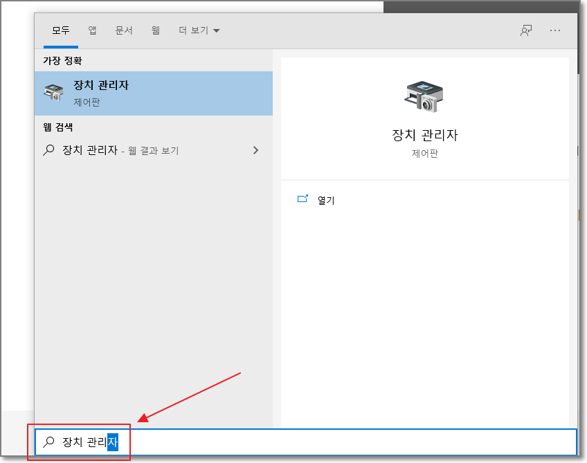 장치관리자의 모니터 드라이버를 삭제해 본다. 장치관리자는 윈도우 버튼을 누르고 바로 해당 단어(장치 관리자)를 입력하면 쉽게 활성화할 수 있다.