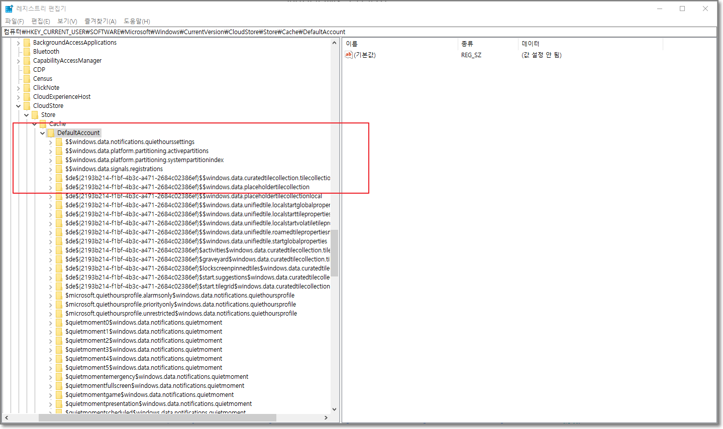 컴퓨터\HKEY_CURRENT_USER\SOFTWARE\Microsoft\Windows\CurrentVersion\CloudStore\Store\Cache\DefaultAccount