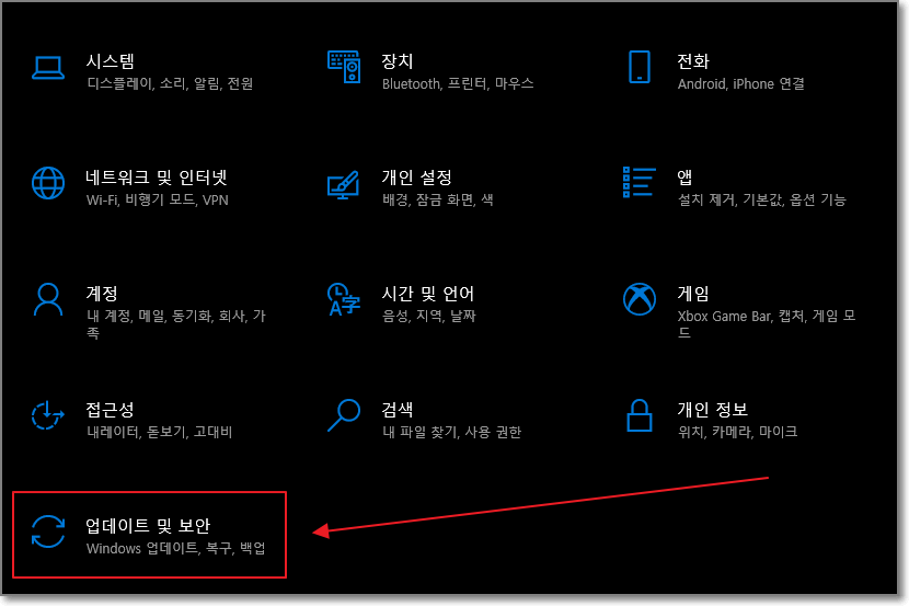 윈도우10 운영체계 버전이 낮을 경우 야간 모드가 활성화되지 않는 경우가 있으니 제어판에서 '업데이트 및 보안' 부분을 선택하여 업데이트 완료 여부를 확인한다. (눈이 안 좋아서 흰색 바탕이 잘 없는 다크 모드를 사용하고 있음을 볼 수 있다...)